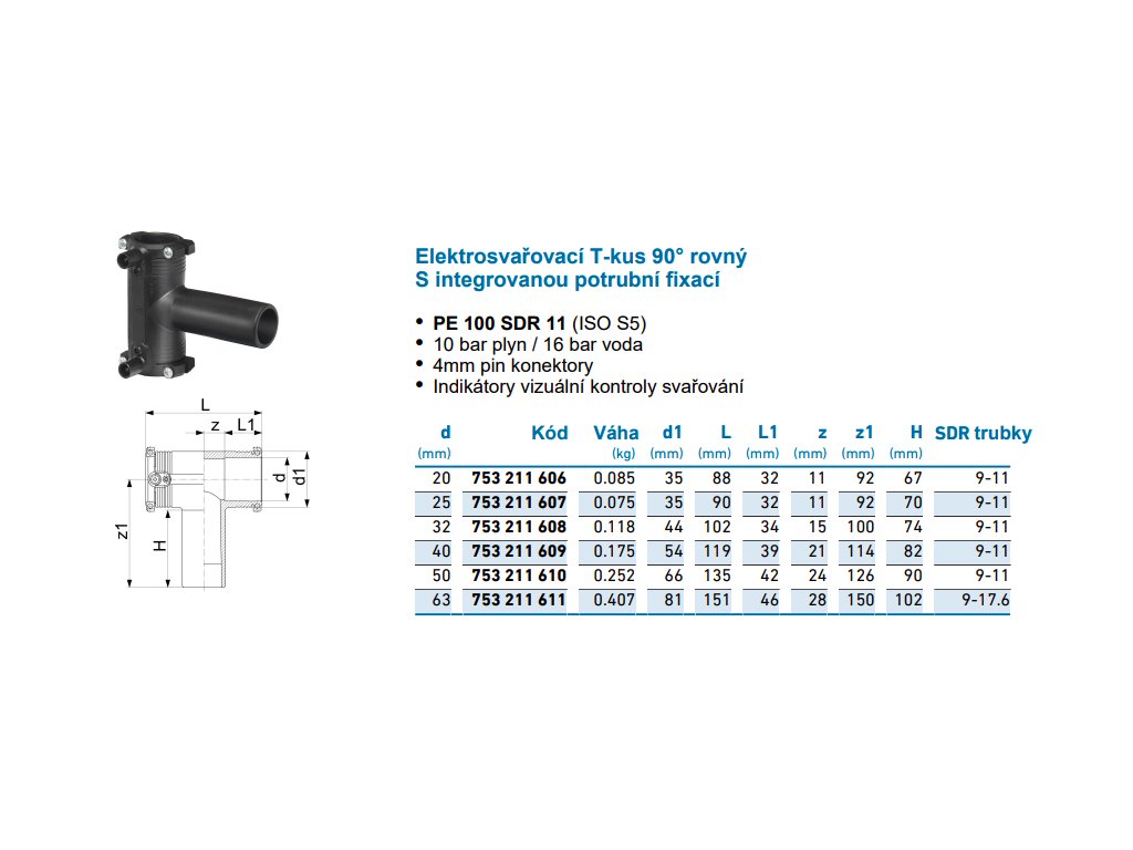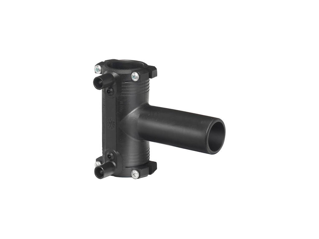 Elektrosvařovací T-kus 90°, PE100 SDR11, s potrubní fixací je určen ke spojování PE trubek v rozvodech tepelných čerpadel, pitné vody (16 bar) a plynu (10 bar).