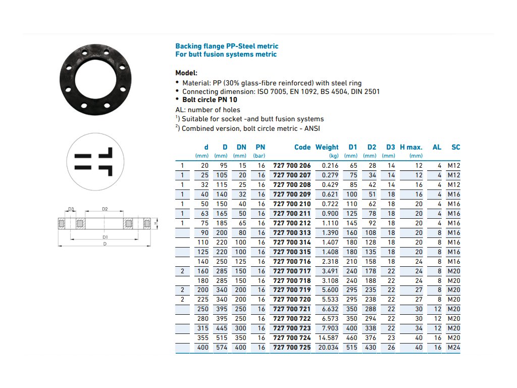 Otočná příruba PP-ocel, Metric ve spojení s Lemovým nákružkem LS, PE100 SDR 11 se používá jako rozebíratelný spoj v systémech s PE trubkami, Elektrotvarovkami nebo s tvarovkami pro svařování natupo v rozvodech tepelných čerpadel, pitné vody (16 bar) a plynu (10 bar).