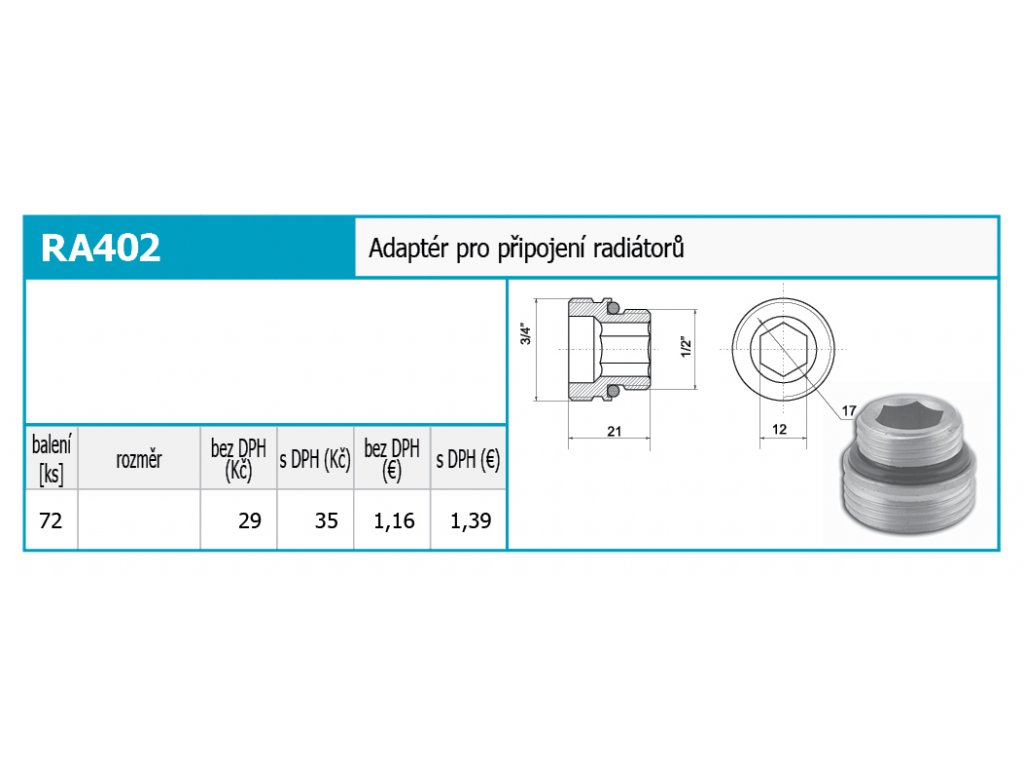 Adaptér pro připojení radiátorů (RA402/1520) 1/2" x 3/4" s těsněním (O kroužek).