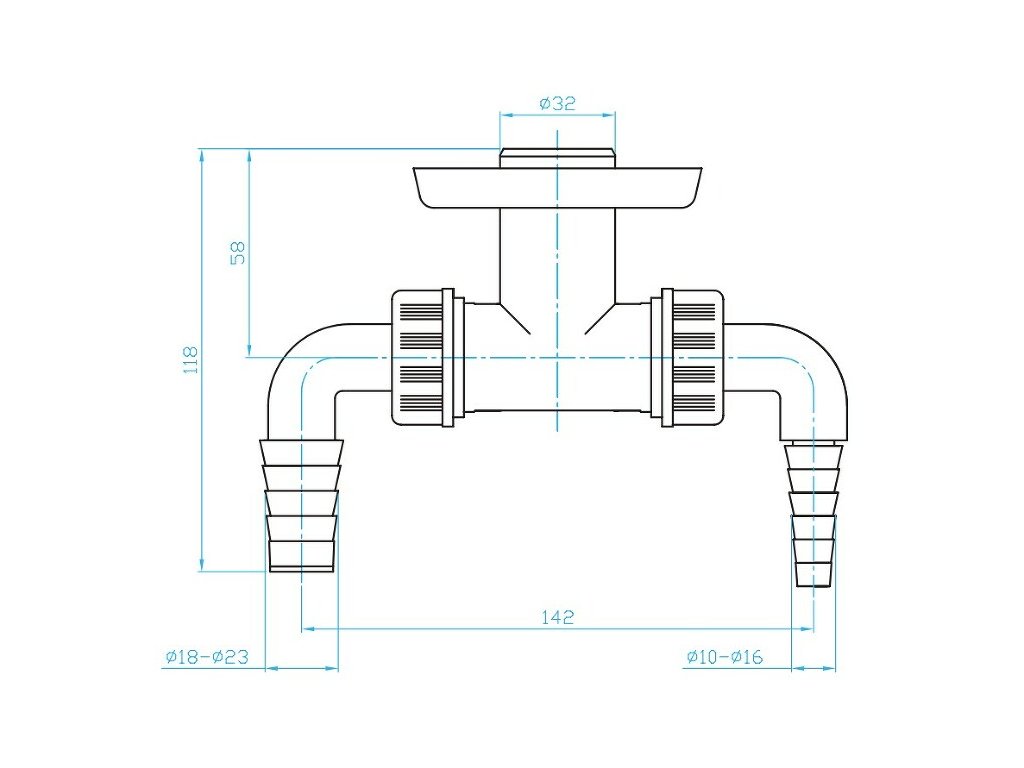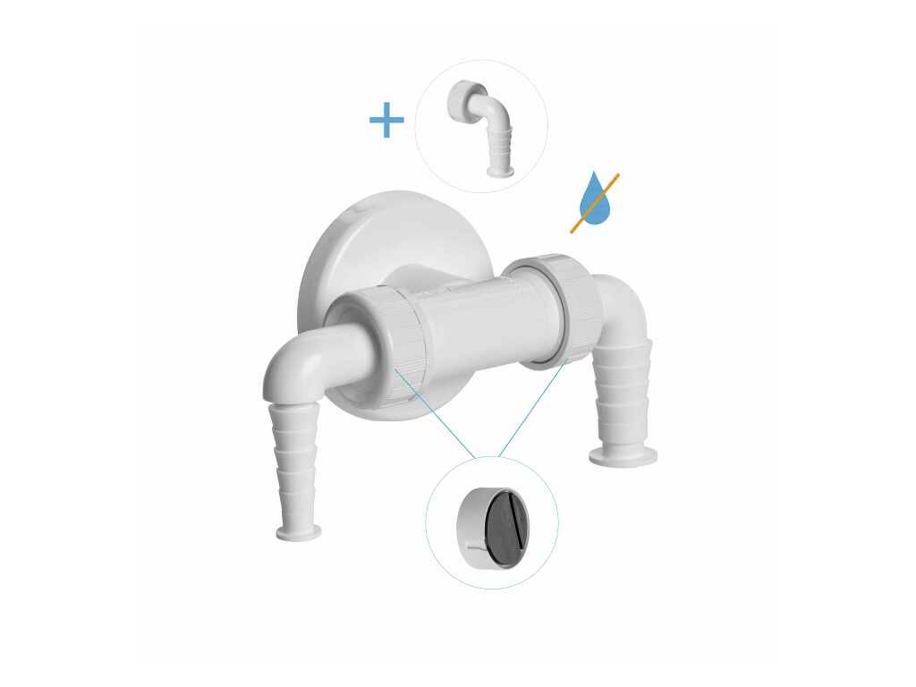 Dvojité připojení na hadice EPT3300 se zpětnými klapkami, DN32 od českého výrobce Plast Brno slouží k připojení dvou hadic různých vnitřních průměrů 10-16 mm a 18-23 mm do odpadního potrubí. Používá se pro připojení pračky, myčky apod. Zpětná klapka uvnitř každé koncovky slouží k zabránění toku z odpadního potrubí zpět do hadice. Uvnitř se nachází také přepážka, která usměrňuje proud vody do odpadu. Bílá zátka slouží k zaslepení koncovky, pokud se nebude používat.