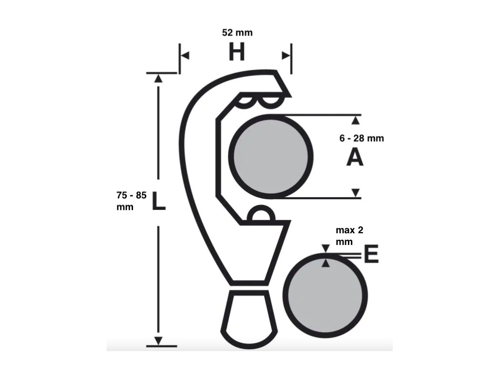 Mini řezák trubek slouží k přesnému dělení trubek typu Cu (měděné), Hliník, Mosaz, Ocel, Nerez, PE, PPR, PEX apod. venkovního průměru 6-28 mm. Je obzvláště vhodný tam, kde je málo místa (mezi dvěma trubkami, u zdi, u kotle, pod umyvadlem, apod.).