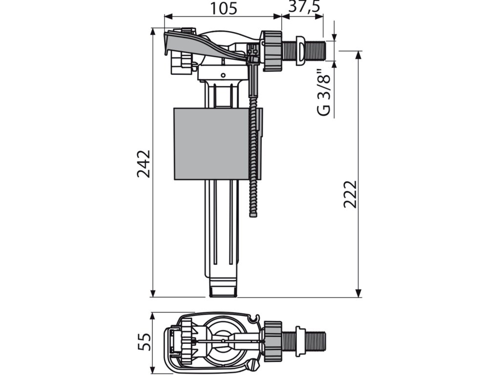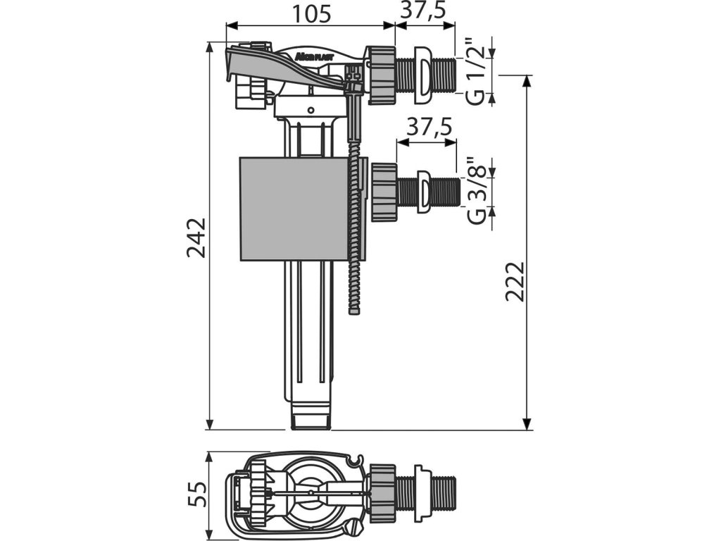 Napouštěcí ventil boční A160 s mosazným připojením 3/8", 1/2" nebo v kombinaci obou 1/2" x 3/8" od českého výrobce Alcadrain (dříve Alcaplast) slouží k automatickému dopouštění vody v keramických i v plastových nádržkách u WC.