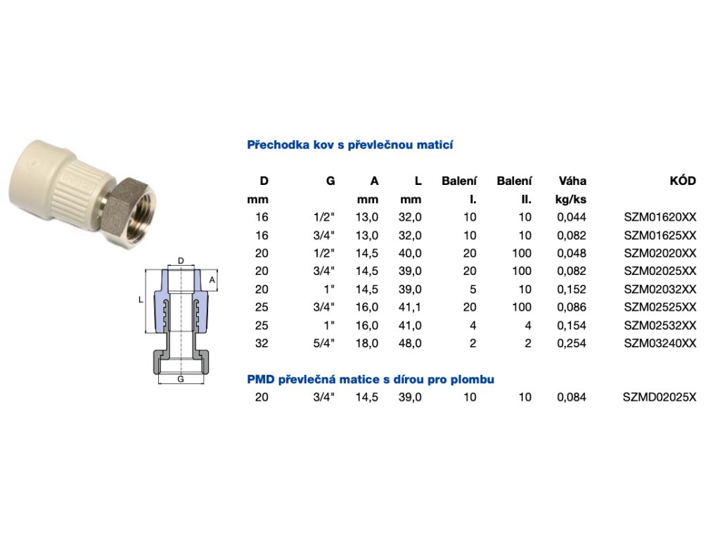 - V případě přechodových tvarovek je použita mosaz