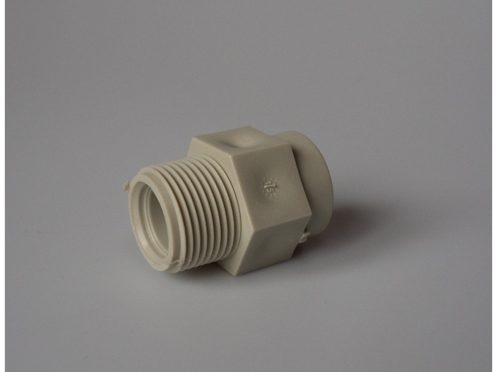 PPR přechodka vnější s plastovým závitem je levnější varianta spoje oproti PPR přechodce s mosazným závitem.