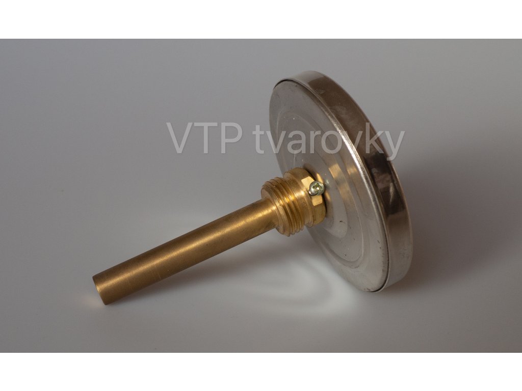Bimetalový teploměr v celokovovém provedení se zadním připojením 1/2" s mosaznou jímkou (u teploměrů délky 150 mm a 200 mm je jímka nerezová).