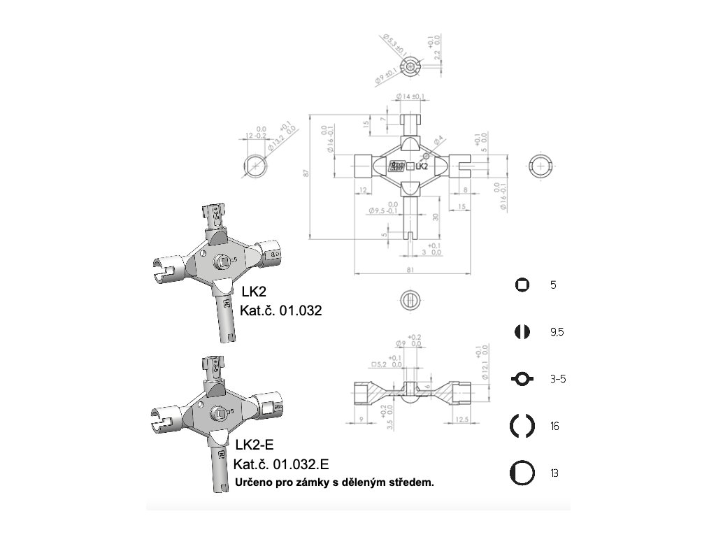 Víceúčelový klíč LK2-E obsahuje nejrůznější varianty klíčů k otevírání rozvodných skříní, zámků s děleným středem i k odvzdušnění radiátorů (otopných těles).