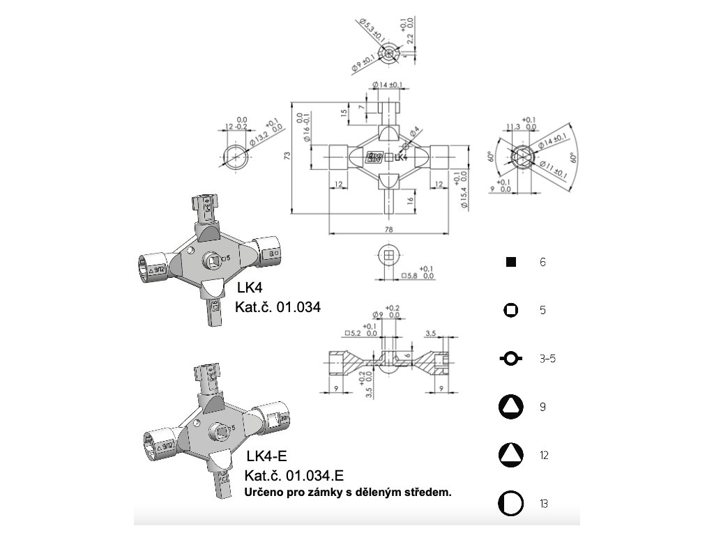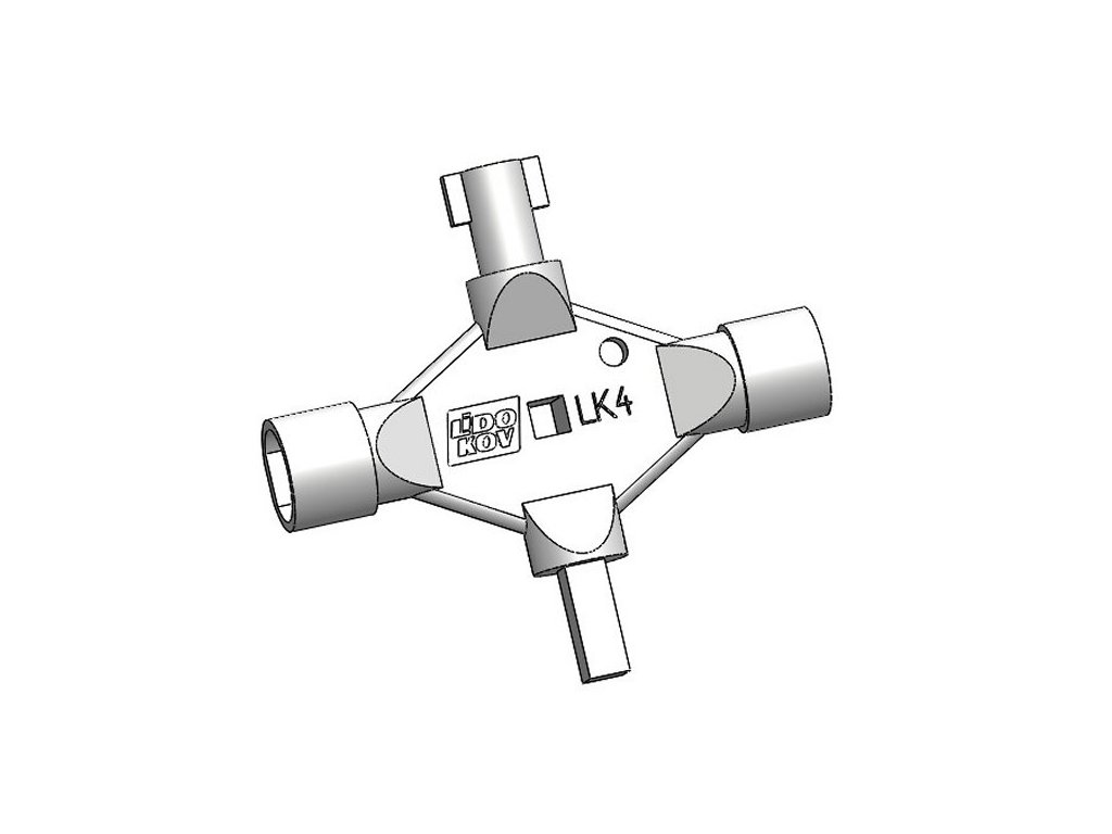 Víceúčelový klíč LK4-E obsahuje nejrůznější varianty klíčů k otevírání rozvodných skříní, zámků s děleným středem i k odvzdušnění radiátorů (otopných těles).